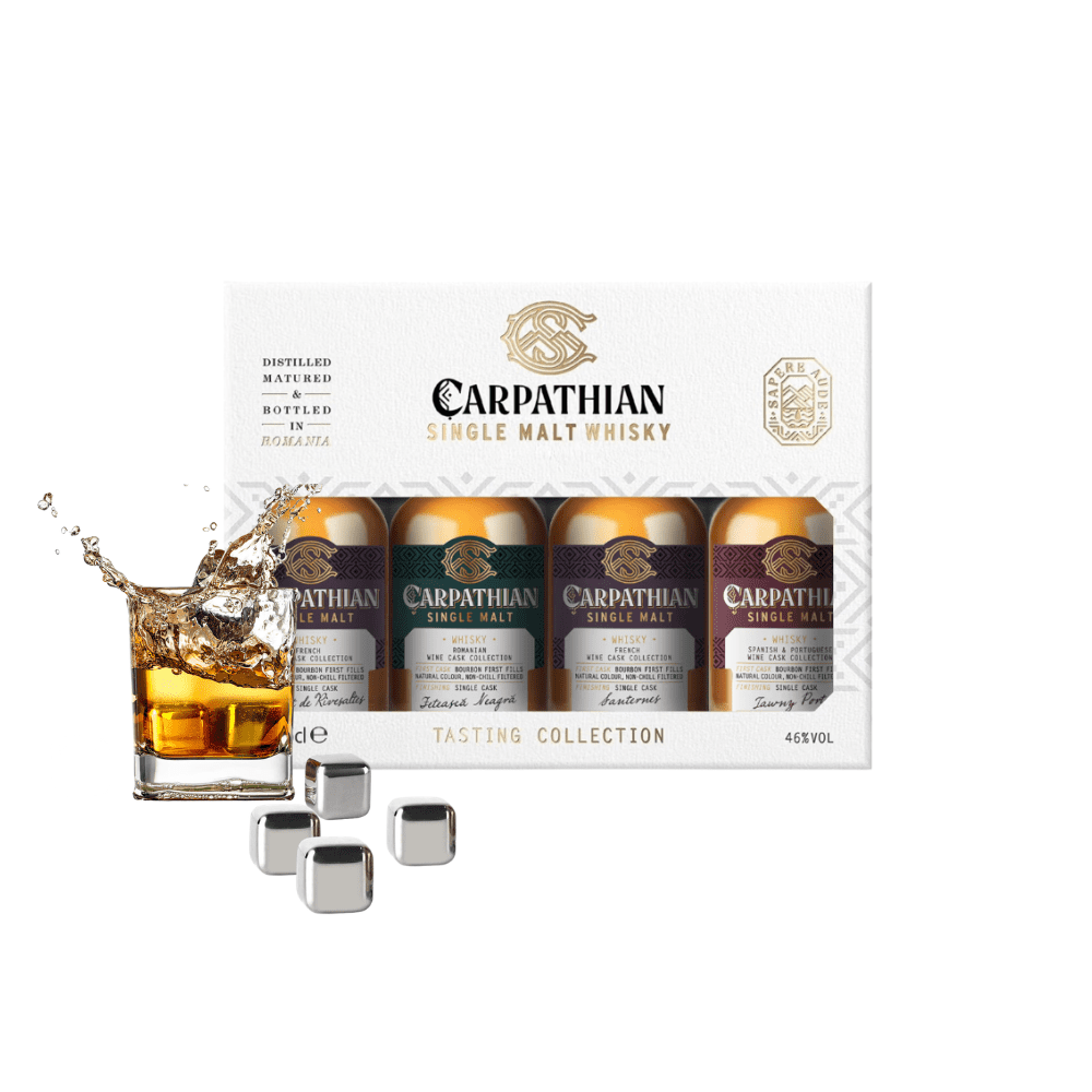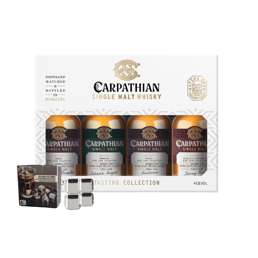 Acest set cadou cu miniaturi Carpathian Single Malt este perfect pentru colecționari și iubitorii de băuturi rafinate. Include 4 miniaturi de single malt românesc premium și cuburi de gheață inox.